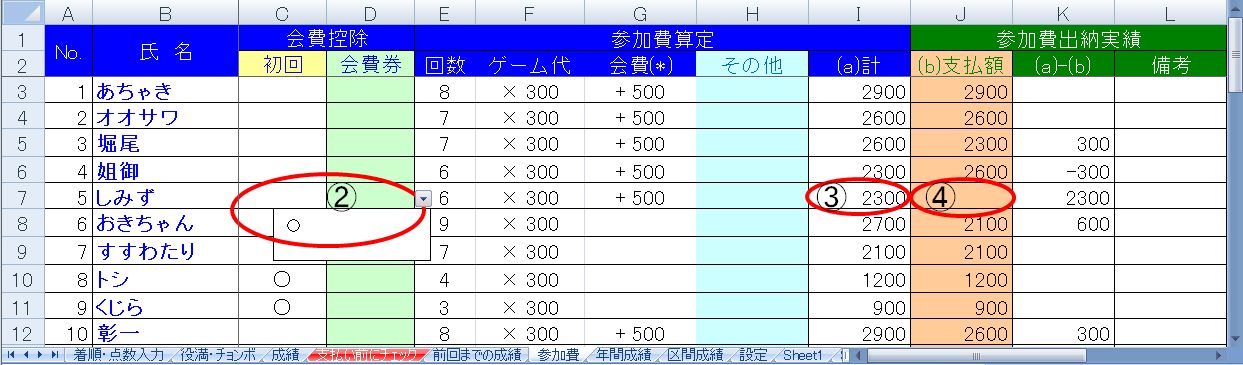 | 名前を入力した際に、「支払い前にチェック」のシートにて過去の支払い間違いをチェックし、 必要に応じ「参加費」のシートの「その他」に入力してください。 |