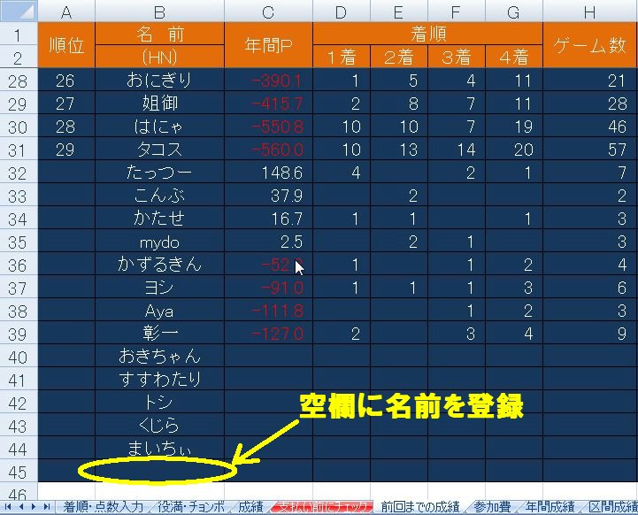 ※ 今年はじめて来た人は、先に「前回までの成績」のシートに自分の名前を登録してください。