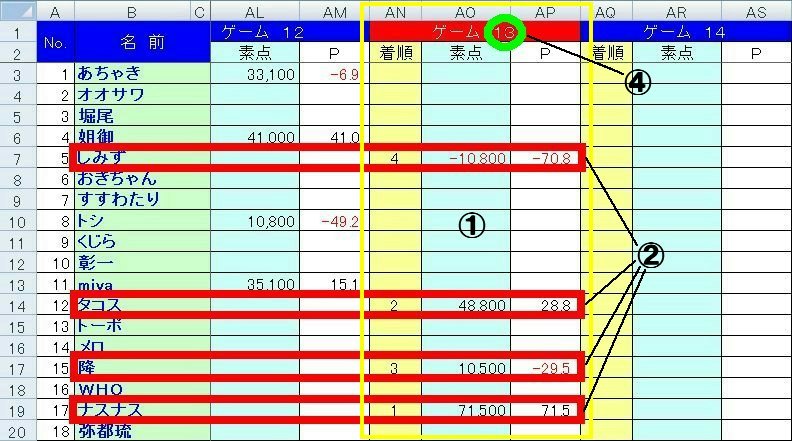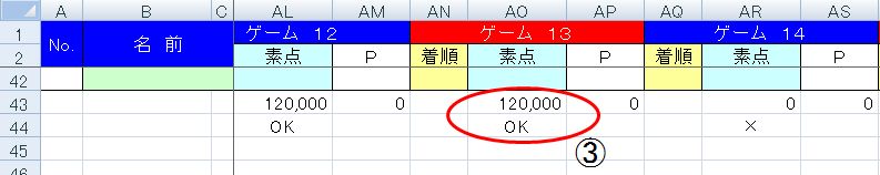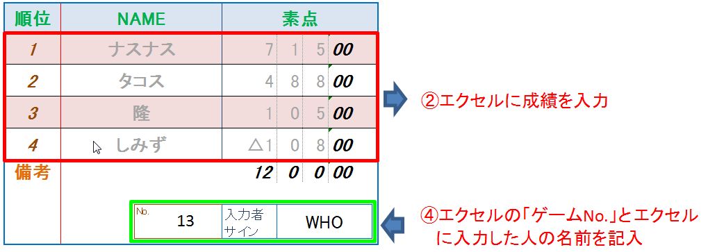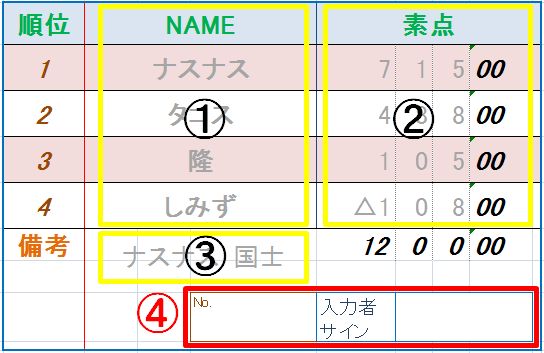 ※ 備考欄に役満やチョンボのメモがある場合は、「役満・チョンボ」のシートにゲームNo.と役満名又はチョンボと入力してください。